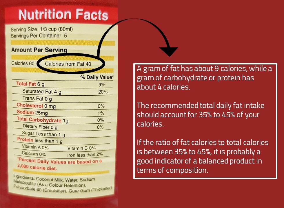 If the package mentions the number of calories from fat, find the ratio of calories from fat to that of total calories. If the ratio is between 35% to 45%, it is probably a good indicator of a somehow balanced product in terms of composition.