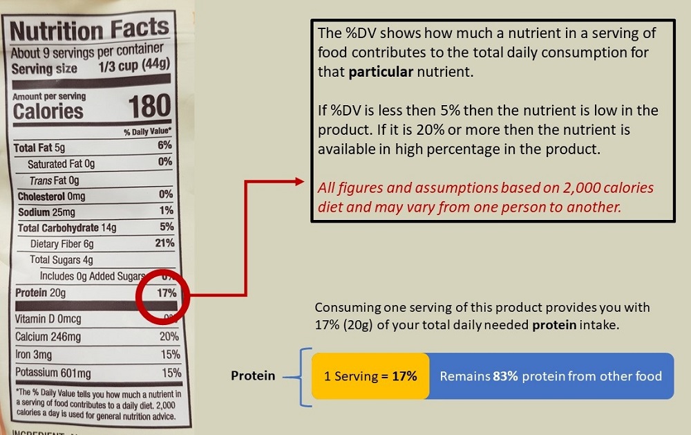 Example: Let's assume that the %DV of sodium is 25% per serving. That means that if you consume one serving of that product, you get 25% of your daily recommended sodium intake.