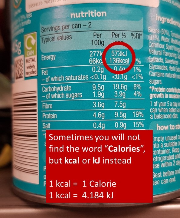 On most labels, you will not find the word calories but Kcal.